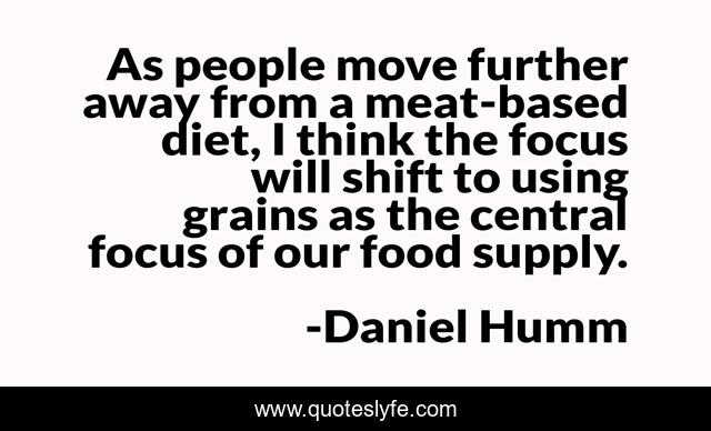 This page presents the quote "As people move further away from a meat-based diet, I think the focus will shift to using grains as the central focus of our food supply.". Author of this quote is Daniel Humm. This quote is about food, focus, people,.