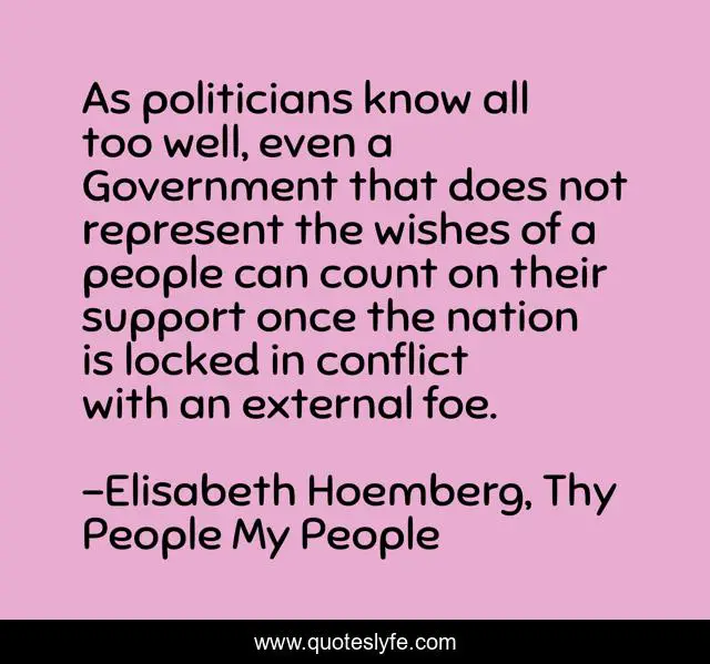 This page presents the quote "As politicians know all too well, even a Government that does not represent the wishes of a people can count on their support once the nation is locked in conflict with an external foe.". Author of this quote is Elisabeth Hoemberg, Thy People My People. This quote is about politics, warfare,.