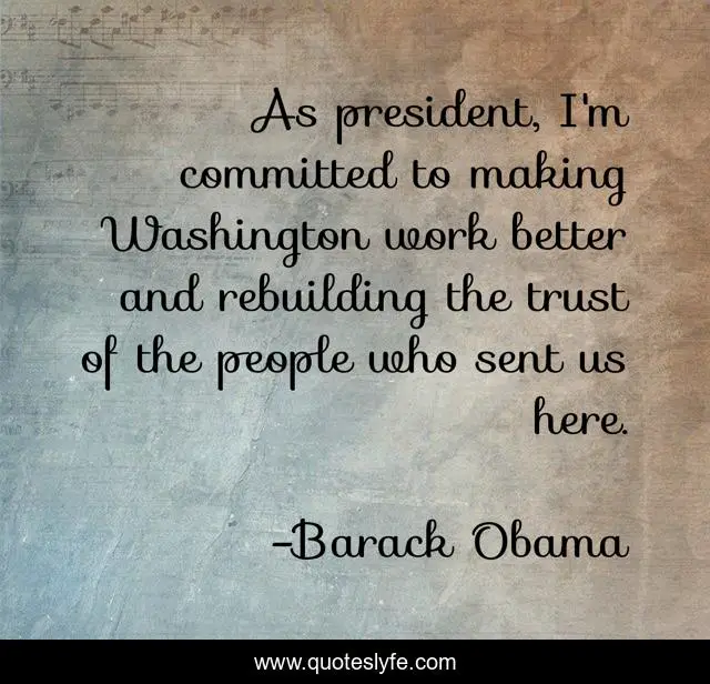 This page presents the quote "As president, I'm committed to making Washington work better and rebuilding the trust of the people who sent us here.". Author of this quote is Barack Obama. This quote is about better, work, people,.
