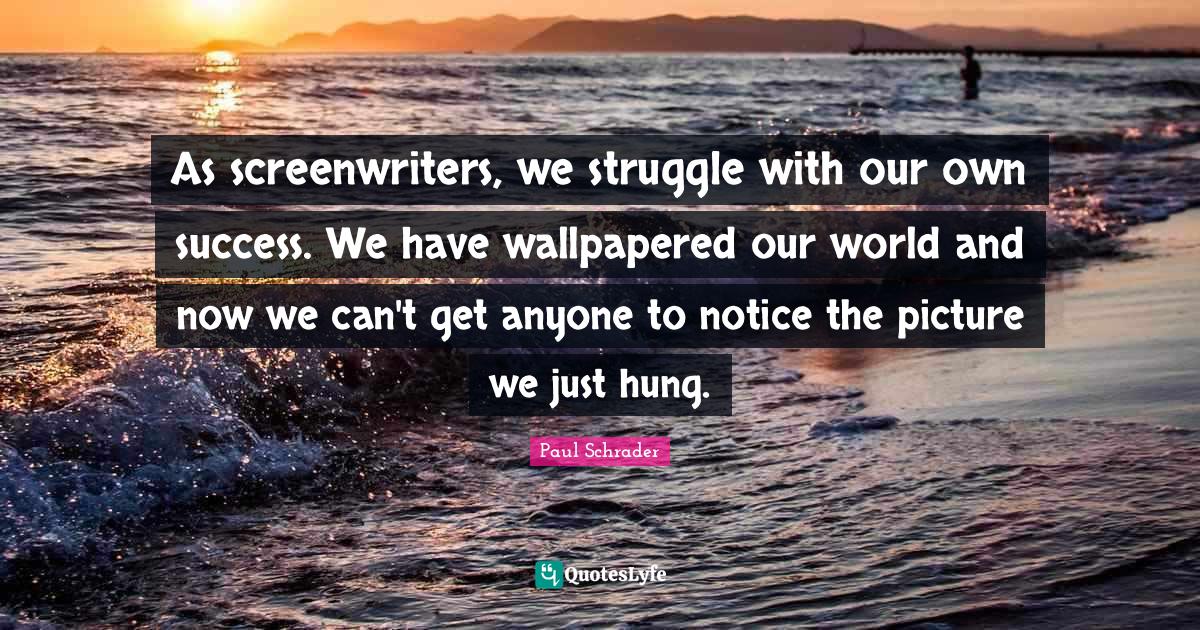 This page presents the quote "As screenwriters, we struggle with our own success. We have wallpapered our world and now we can't get anyone to notice the picture we just hung.". Author of this quote is Paul Schrader. This quote is about hung, success, struggle, our world, screenwriters,.