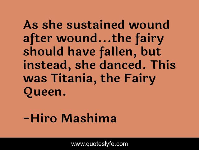 This page presents the quote "As she sustained wound after wound...the fairy should have fallen, but instead, she danced. This was Titania, the Fairy Queen.". Author of this quote is Hiro Mashima. This quote is about power, endurance, inspirational, ambition, enthusiasm, erza-scarlet,.