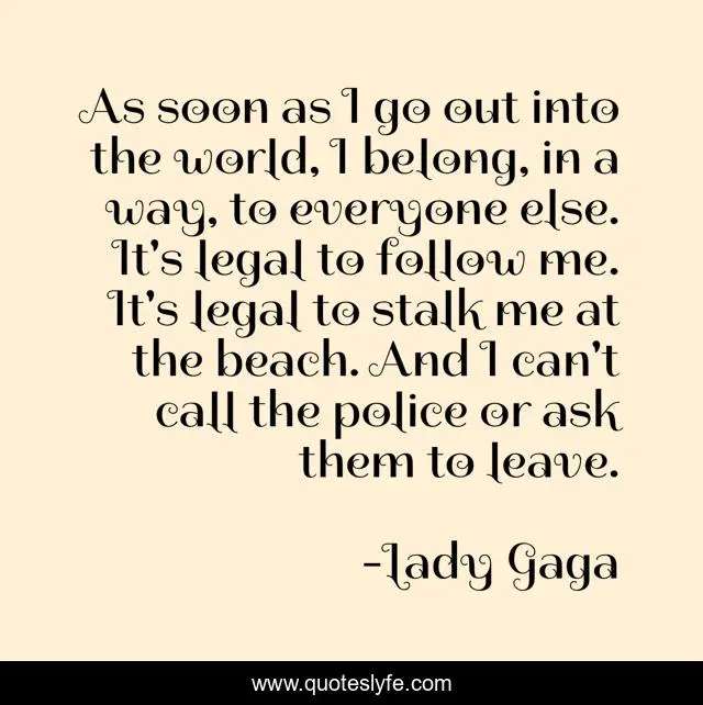 This page presents the quote "As soon as I go out into the world, I belong, in a way, to everyone else. It's legal to follow me. It's legal to stalk me at the beach. And I can't call the police or ask them to leave.". Author of this quote is Lady Gaga. This quote is about me, world, beach,.
