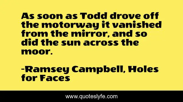 This page presents the quote "As soon as Todd drove off the motorway it vanished from the mirror, and so did the sun across the moor.". Author of this quote is Ramsey Campbell, Holes for Faces. This quote is about horror-authors, horror, horror-fiction,.