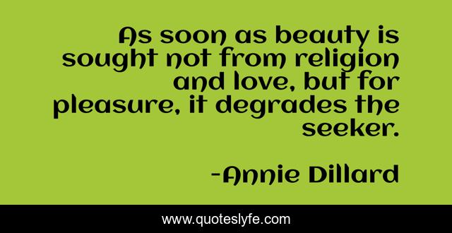 This page presents the quote "As soon as beauty is sought not from religion and love, but for pleasure, it degrades the seeker.". Author of this quote is Annie Dillard. This quote is about religion, love, affection, pleasure,.