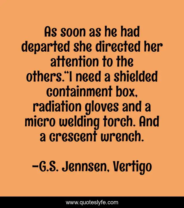 This page presents the quote "As soon as he had departed she directed her attention to the others.“I need a shielded containment box, radiation gloves and a micro welding torch. And a crescent wrench.". Author of this quote is G.S. Jennsen, Vertigo. This quote is about space-opera, adventure, science-fiction,.