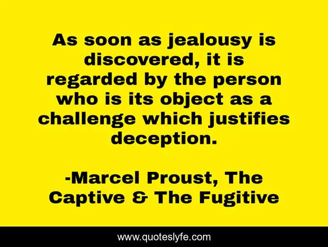This page presents the quote "As soon as jealousy is discovered, it is regarded by the person who is its object as a challenge which justifies deception.". Author of this quote is Marcel Proust, The Captive & The Fugitive. This quote is about deception, jealousy,.