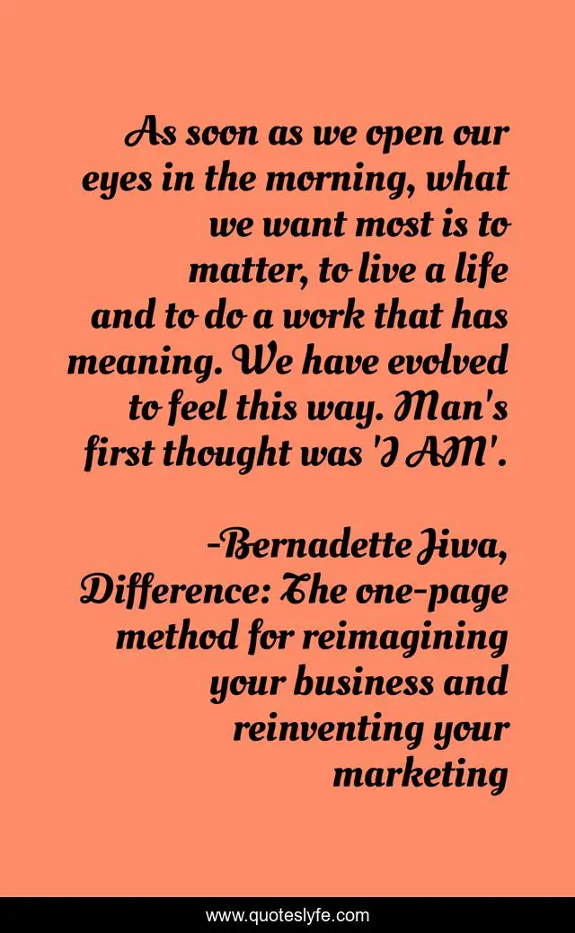 This page presents the quote "As soon as we open our eyes in the morning, what we want most is to matter, to live a life and to do a work that has meaning. We have evolved to feel this way. Man's first thought was 'I AM'.". Author of this quote is Bernadette Jiwa, Difference: The one-page method for reimagining your business and reinventing your marketing. This quote is about empathy, business, storytelling, marketing, inspirational, life-meaning, enthusiasm,.