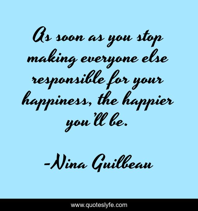 This page presents the quote "As soon as you stop making everyone else responsible for your happiness, the happier you’ll be.". Author of this quote is Nina Guilbeau. This quote is about happiness-life, spiritual-growth, peace, self-esteem,.