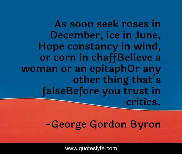 This page presents the quote "As soon seek roses in December, ice in June, Hope constancy in wind, or corn in chaffBelieve a woman or an epitaphOr any other thing that’s falseBefore you trust in critics.". Author of this quote is George Gordon Byron. .