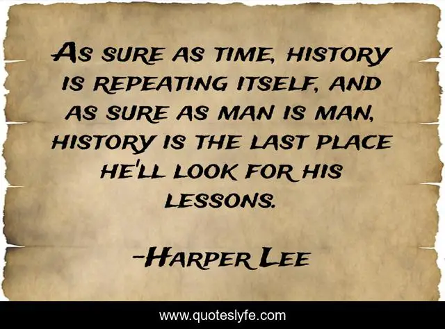 This page presents the quote "As sure as time, history is repeating itself, and as sure as man is man, history is the last place he'll look for his lessons.". Author of this quote is Harper Lee. This quote is about mankind, history,.