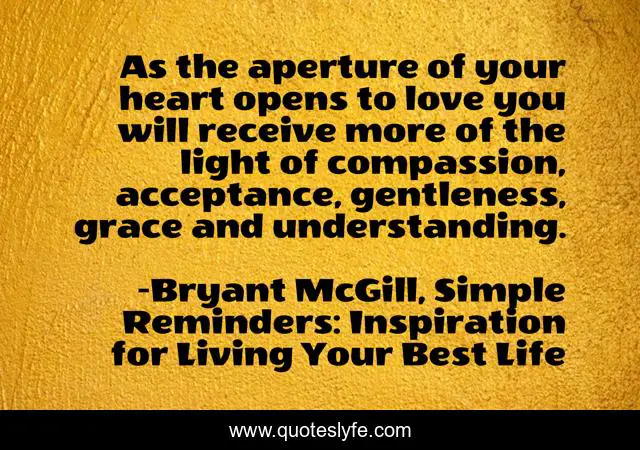 This page presents the quote "As the aperture of your heart opens to love you will receive more of the light of compassion, acceptance, gentleness, grace and understanding.". Author of this quote is Bryant McGill, Simple Reminders: Inspiration for Living Your Best Life. This quote is about gentleness, compassion, acceptance, understanding, recieving, love, grace, affection,.