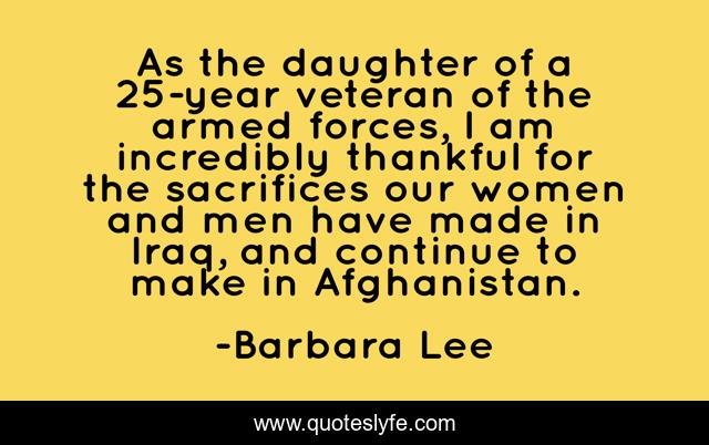 This page presents the quote "As the daughter of a 25-year veteran of the armed forces, I am incredibly thankful for the sacrifices our women and men have made in Iraq, and continue to make in Afghanistan.". Author of this quote is Barbara Lee. This quote is about daughter, women,.