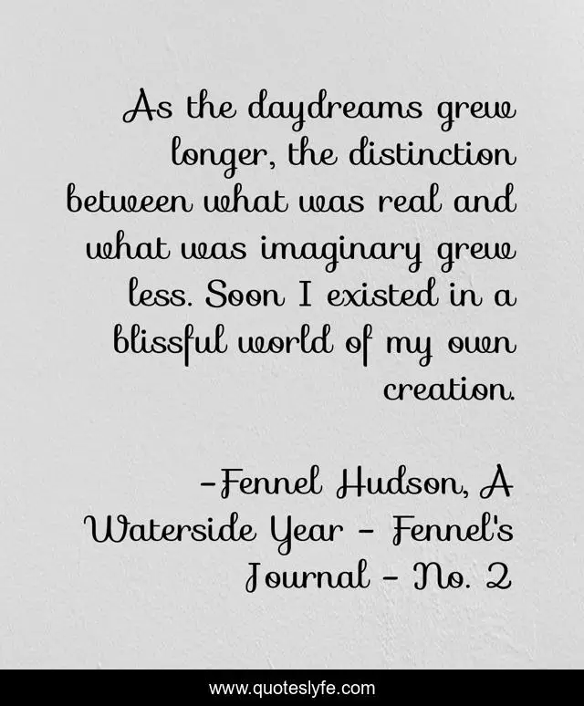 This page presents the quote "As the daydreams grew longer, the distinction between what was real and what was imaginary grew less. Soon I existed in a blissful world of my own creation.". Author of this quote is Fennel Hudson, A Waterside Year - Fennel's Journal - No. 2. This quote is about fantasy, reality, daydreams, dreams, imaginary-world,.
