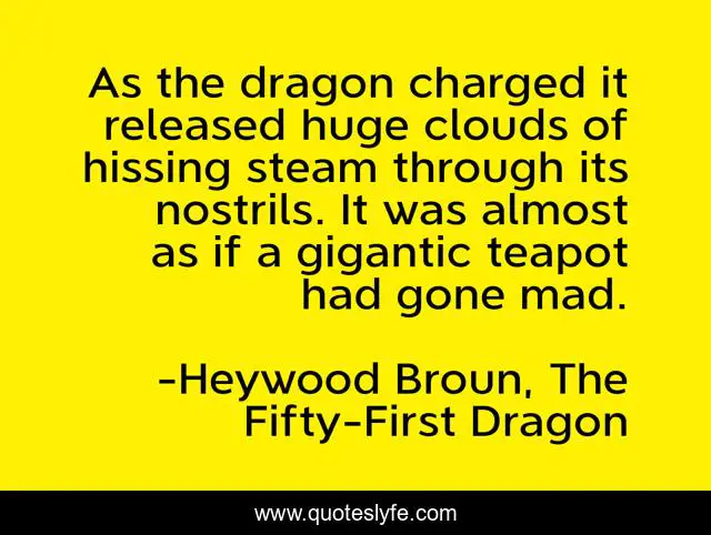 This page presents the quote "As the dragon charged it released huge clouds of hissing steam through its nostrils. It was almost as if a gigantic teapot had gone mad.". Author of this quote is Heywood Broun, The Fifty-First Dragon. .