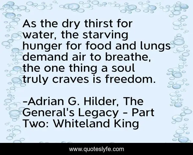 This page presents the quote "As the dry thirst for water, the starving hunger for food and lungs demand air to breathe, the one thing a soul truly craves is freedom.". Author of this quote is Adrian G. Hilder, The General's Legacy - Part Two: Whiteland King. .