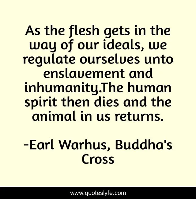 This page presents the quote "As the flesh gets in the way of our ideals, we regulate ourselves unto enslavement and inhumanity.The human spirit then dies and the animal in us returns.". Author of this quote is Earl Warhus, Buddha's Cross. This quote is about nanny-state, political, fantasy, revolution, manifesto, literary-fiction,.