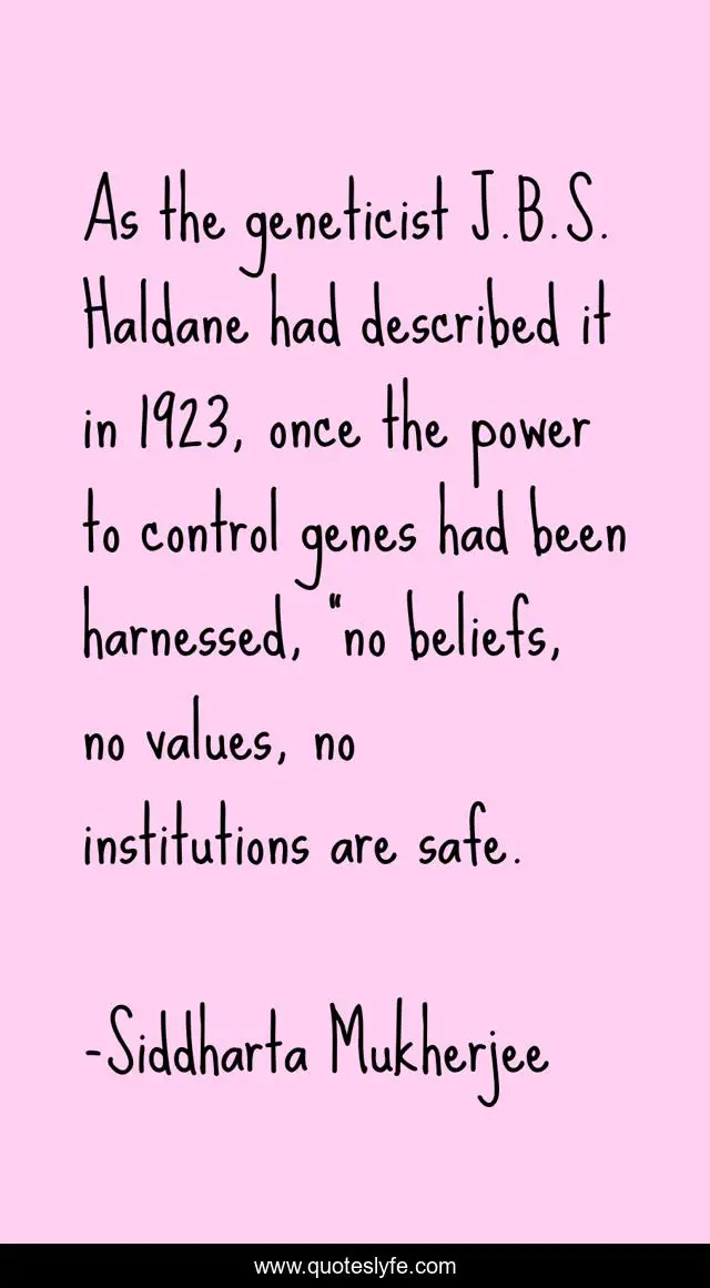 This page presents the quote "As the geneticist J.B.S. Haldane had described it in 1923, once the power to control genes had been harnessed, "no beliefs, no values, no institutions are safe.". Author of this quote is Siddharta Mukherjee. .
