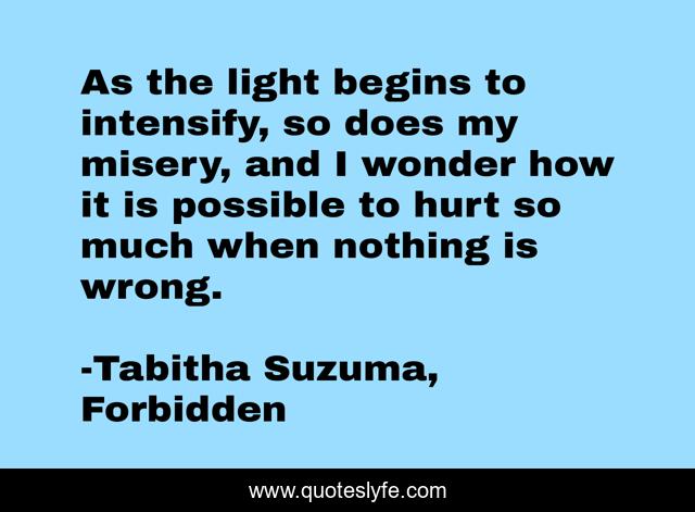 This page presents the quote "As the light begins to intensify, so does my misery, and I wonder how it is possible to hurt so much when nothing is wrong.". Author of this quote is Tabitha Suzuma, Forbidden. This quote is about love, bhie, lochan, forbidden, hurt, affection, tabitha-suzuma,.