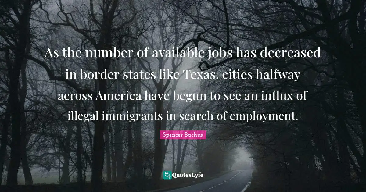This page presents the quote "As the number of available jobs has decreased in border states like Texas, cities halfway across America have begun to see an influx of illegal immigrants in search of employment.". Author of this quote is Spencer Bachus. This quote is about available, halfway, jobs, cities, states, america, employment, texas, illegal immigrants,.