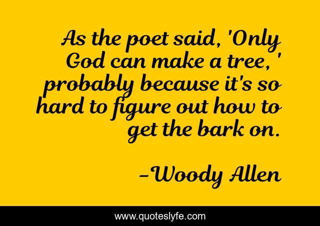 This page presents the quote "As the poet said, 'Only God can make a tree, ' probably because it's so hard to figure out how to get the bark on.". Author of this quote is Woody Allen. This quote is about god, said, tree,.