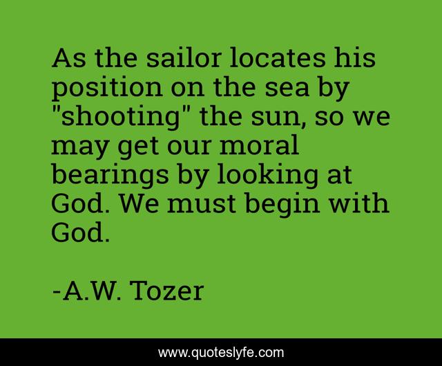 This page presents the quote "As the sailor locates his position on the sea by "shooting" the sun, so we may get our moral bearings by looking at God. We must begin with God.". Author of this quote is A.W. Tozer. This quote is about religion, christianity, christian, morality,.