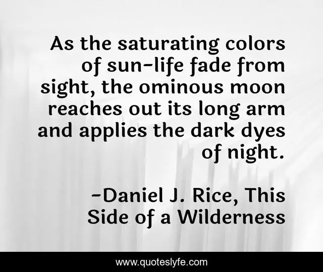 This page presents the quote "As the saturating colors of sun-life fade from sight, the ominous moon reaches out its long arm and applies the dark dyes of night.". Author of this quote is Daniel J. Rice, This Side of a Wilderness. This quote is about life, art, wilderness, beauty, nature, color, scenic, night, moon,.