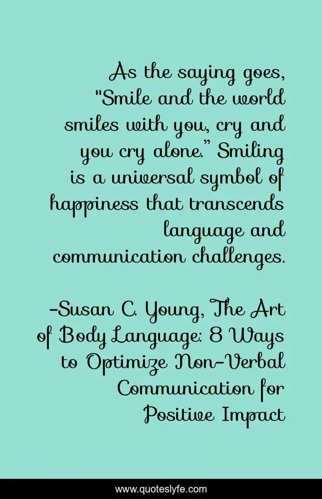 "Susan C. Young, The Art of Body Language: 8 Ways to Optimize Non-Verbal Communication for Positive Impact Quotes." Quoteslyfe.com, 2025. Sun. 07 Dec. 2025. <https://www.quoteslyfe.com/quote/As-the-saying-goes-Smile-and-the-233512>.