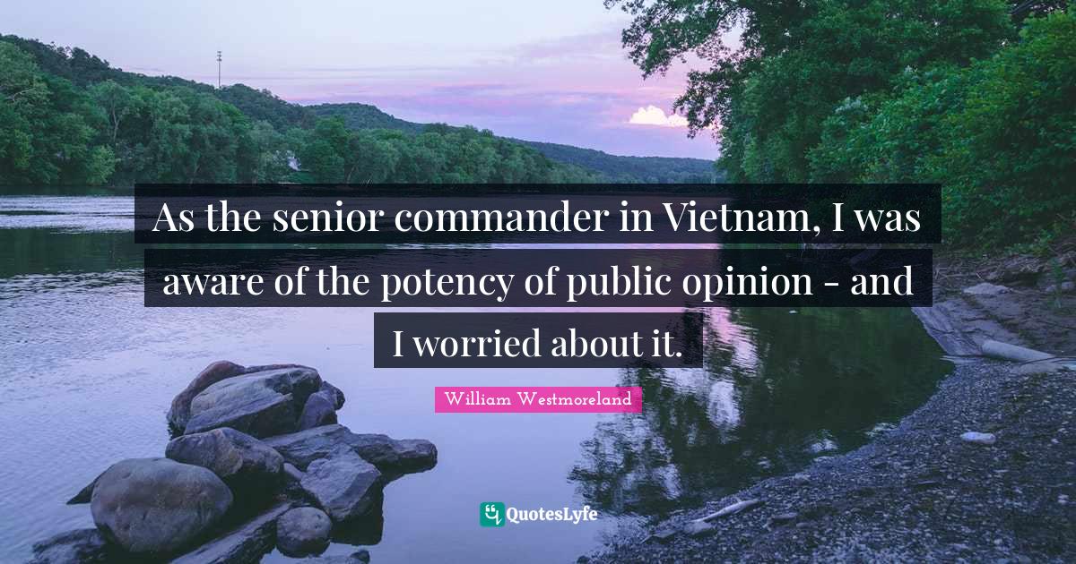 This page presents the quote "As the senior commander in Vietnam, I was aware of the potency of public opinion - and I worried about it.". Author of this quote is William Westmoreland. This quote is about potency, public opinion, worried, senior, vietnam,.