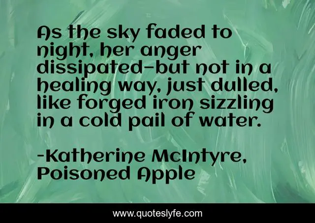 This page presents the quote "As the sky faded to night, her anger dissipated—but not in a healing way, just dulled, like forged iron sizzling in a cold pail of water.". Author of this quote is Katherine McIntyre, Poisoned Apple. This quote is about loss, cold-anger, grief, sunset, anger, dulled-anger, forged-iron,.