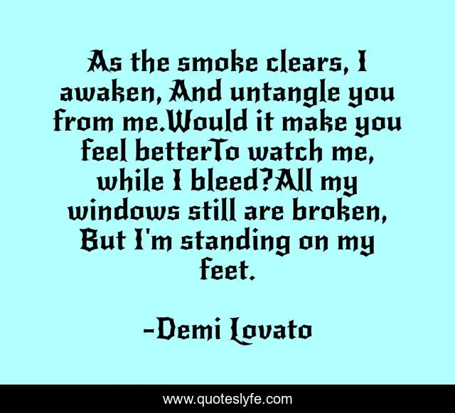 This page presents the quote "As the smoke clears, I awaken, And untangle you from me.Would it make you feel betterTo watch me, while I bleed?All my windows still are broken, But I'm standing on my feet.". Author of this quote is Demi Lovato. This quote is about demi-lovato, enthusiasm, inspirational, lyrics, skyscraper,.