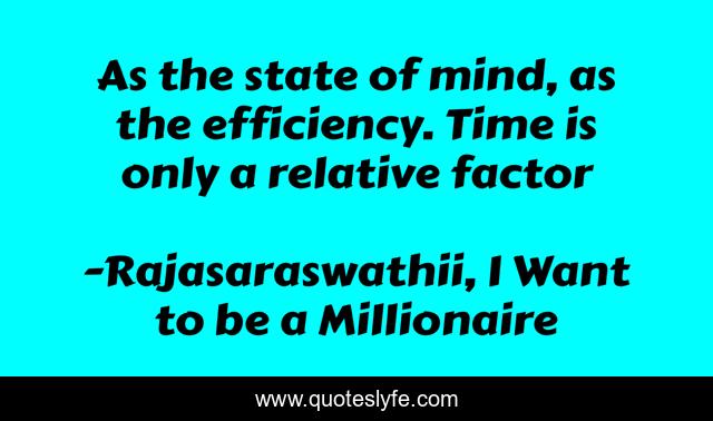 This page presents the quote "As the state of mind, as the efficiency. Time is only a relative factor". Author of this quote is Rajasaraswathii, I Want to be a Millionaire. This quote is about time-management, management, positive, motivational, confidence, leadership, optimistic, inspirational, self-help,.