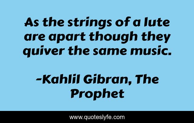 This page presents the quote "As the strings of a lute are apart though they quiver the same music.". Author of this quote is Kahlil Gibran, The Prophet. .