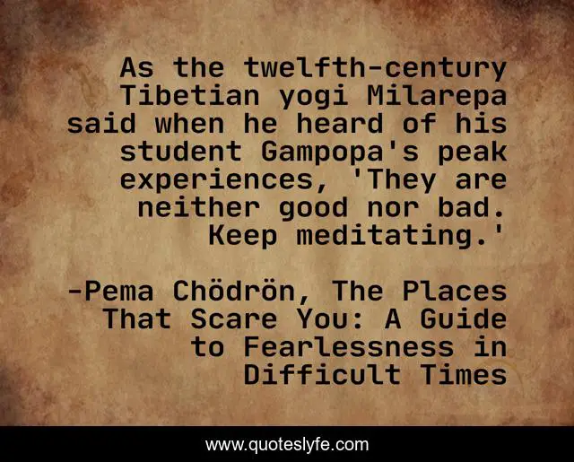 This page presents the quote "As the twelfth-century Tibetian yogi Milarepa said when he heard of his student Gampopa's peak experiences, 'They are neither good nor bad. Keep meditating.'". Author of this quote is Pema Chödrön, The Places That Scare You: A Guide to Fearlessness in Difficult Times. This quote is about buddhism, detachment,.