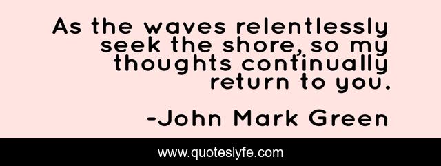 This page presents the quote "As the waves relentlessly seek the shore, so my thoughts continually return to you.". Author of this quote is John Mark Green. This quote is about love, romantic, relationship, romance, thoughts, waves, affection,.