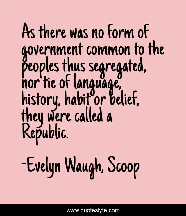 This page presents the quote "As there was no form of government common to the peoples thus segregated, nor tie of language, history, habit or belief, they were called a Republic.". Author of this quote is Evelyn Waugh, Scoop. .