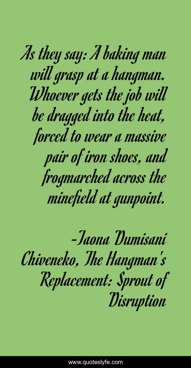This page presents the quote "As they say: A baking man will grasp at a hangman. Whoever gets the job will be dragged into the heat, forced to wear a massive pair of iron shoes, and frogmarched across the minefield at gunpoint.". Author of this quote is Taona Dumisani Chiveneko, The Hangman's Replacement: Sprout of Disruption. This quote is about africa, great-zimbabwe, hangman, parnormal, zimbabwe, flame-lily, mystrey, thriller,.