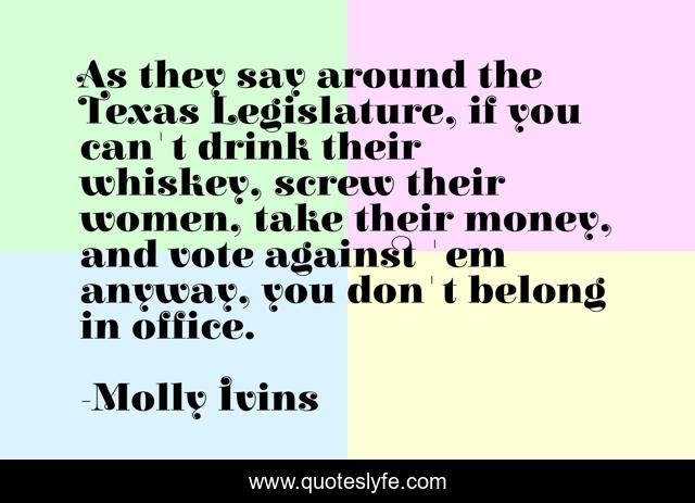 This page presents the quote "As they say around the Texas Legislature, if you can't drink their whiskey, screw their women, take their money, and vote against 'em anyway, you don't belong in office.". Author of this quote is Molly Ivins. This quote is about politics, humor, texas,.