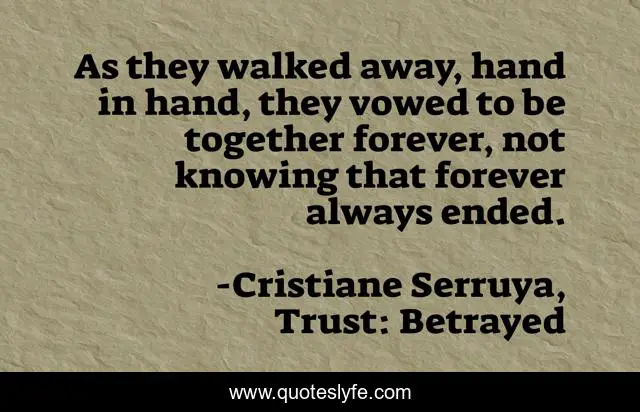 This page presents the quote "As they walked away, hand in hand, they vowed to be together forever, not knowing that forever always ended.". Author of this quote is Cristiane Serruya, Trust: Betrayed. This quote is about forever, endings, together, vows,.