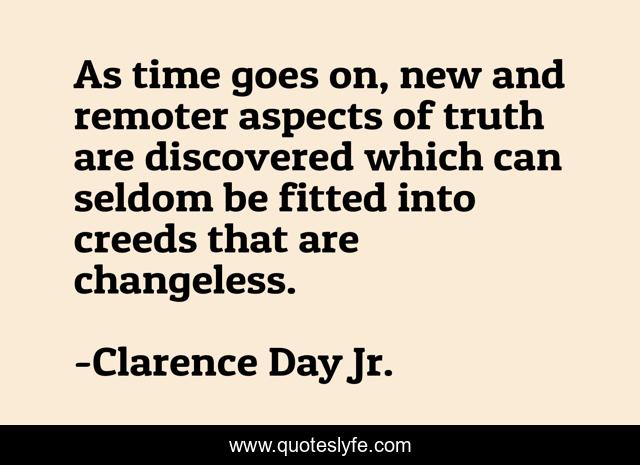 This page presents the quote "As time goes on, new and remoter aspects of truth are discovered which can seldom be fitted into creeds that are changeless.". Author of this quote is Clarence Day Jr.. This quote is about dogma, religion, truth, creeds, change, discovery,.