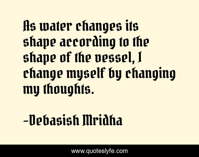 This page presents the quote "As water changes its shape according to the shape of the vessel, I change myself by changing my thoughts.". Author of this quote is Debasish Mridha. This quote is about philosophy, how-to-change-your-life, changing-my-thoughts, debasish-mridha, adapting-to-your-situation, quotes, inspirational, enthusiasm, changing-myself,.