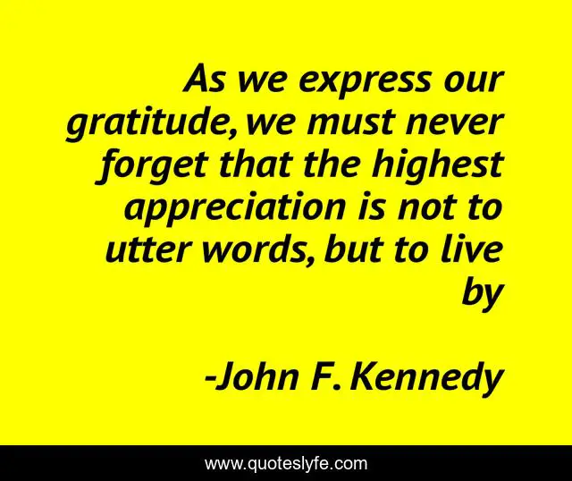 This page presents the quote "As we express our gratitude, we must never forget that the highest appreciation is not to utter words, but to live by". Author of this quote is John F. Kennedy. This quote is about gratitude, sincerity,.