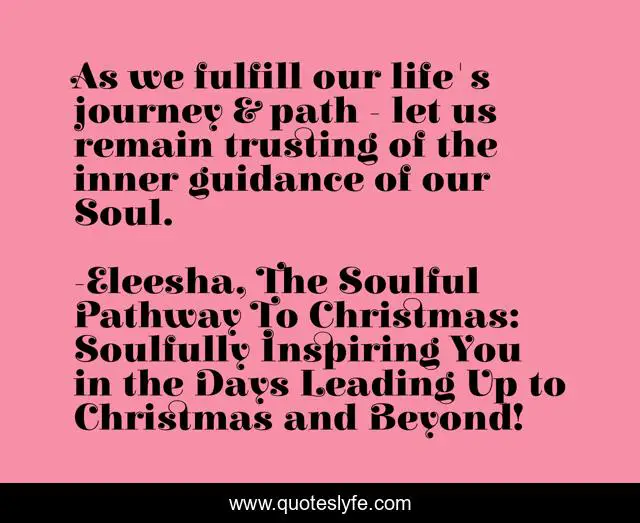 This page presents the quote "As we fulfill our life's journey & path - let us remain trusting of the inner guidance of our Soul.". Author of this quote is Eleesha, The Soulful Pathway To Christmas: Soulfully Inspiring You in the Days Leading Up to Christmas and Beyond!. This quote is about christmas-spirit, positive, motivational, empowerment, soul, quotes, channeling, inspirational, affirmations,.