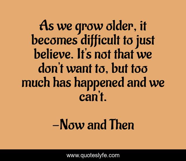 This page presents the quote "As we grow older, it becomes difficult to just believe. It's not that we don't want to, but too much has happened and we can't.". Author of this quote is Now and Then. This quote is about faith, growth, movie,.