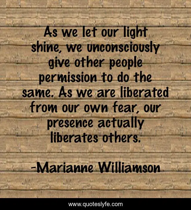 This page presents the quote "As we let our light shine, we unconsciously give other people permission to do the same. As we are liberated from our own fear, our presence actually liberates others.". Author of this quote is Marianne Williamson. This quote is about shine, light, people,.