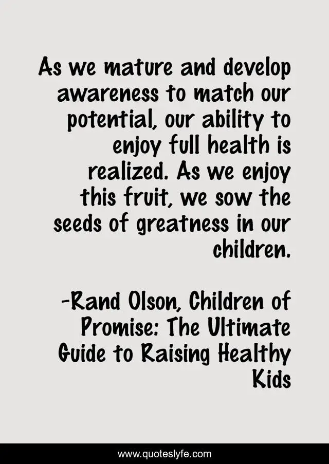 This page presents the quote "As we mature and develop awareness to match our potential, our ability to enjoy full health is realized. As we enjoy this fruit, we sow the seeds of greatness in our children.". Author of this quote is Rand Olson, Children of Promise: The Ultimate Guide to Raising Healthy Kids. This quote is about parenting, health,.