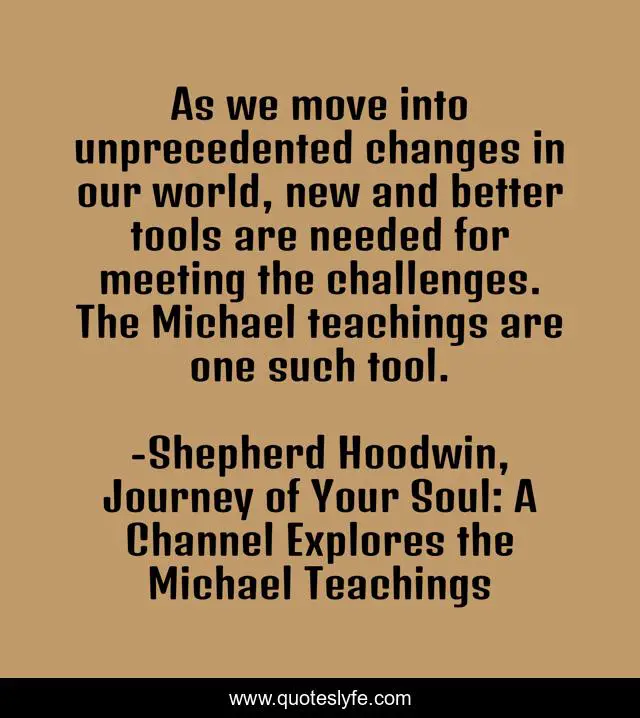 This page presents the quote "As we move into unprecedented changes in our world, new and better tools are needed for meeting the challenges. The Michael teachings are one such tool.". Author of this quote is Shepherd Hoodwin, Journey of Your Soul: A Channel Explores the Michael Teachings. This quote is about journey, michael-teachings, soul,.