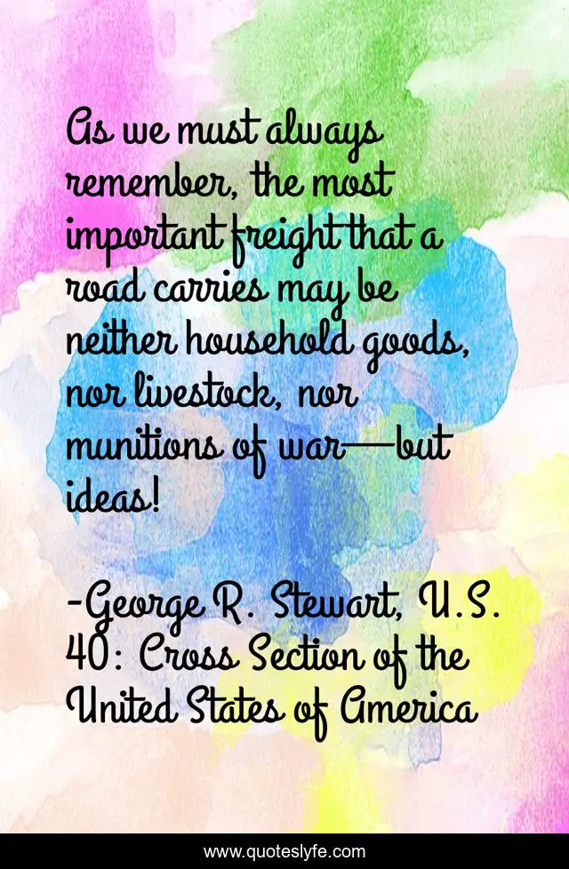 This page presents the quote "As we must always remember, the most important freight that a road carries may be neither household goods, nor livestock, nor munitions of war—but ideas!". Author of this quote is George R. Stewart, U.S. 40: Cross Section of the United States of America. This quote is about roads, ideas, freight,.