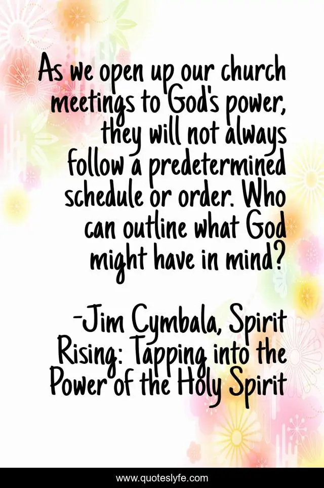 This page presents the quote "As we open up our church meetings to God's power, they will not always follow a predetermined schedule or order. Who can outline what God might have in mind?". Author of this quote is Jim Cymbala, Spirit Rising: Tapping into the Power of the Holy Spirit. .