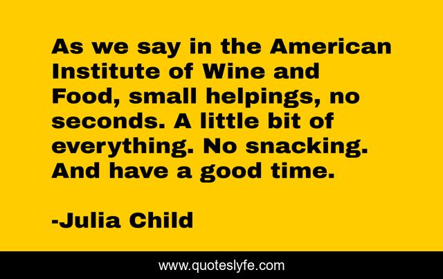 This page presents the quote "As we say in the American Institute of Wine and Food, small helpings, no seconds. A little bit of everything. No snacking. And have a good time.". Author of this quote is Julia Child. This quote is about american, good, time,.