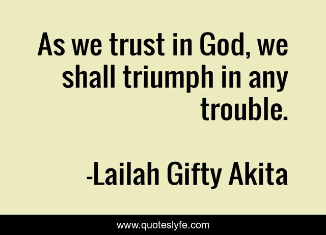 This page presents the quote "As we trust in God, we shall triumph in any trouble.". Author of this quote is Lailah Gifty Akita. This quote is about motivation, difficulties, triumph, trust-in-god,.